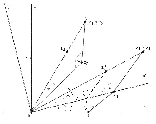 Dodawanie liczb zespolonych można geometrycznie interpretować jako przesnięcie punktu 0 płaszczyzny do punktu z1 (płaszczyzna v" - h"), oznaczającego liczbę dodawaną. ![]() Dodawanie liczb zespolonych z2 + z1 ![]() Odejmowanie to przesunięcie odwrotne. ![]() Mnożenie przez z1 przeprowadza się przez skręcenie płaszczyzny zespolonej przeprowadzające oś h na z1 (płaszczyzna v'- h'). ![]() ![]() Mnożenie liczb zespolonych Punkty po obrocie na rysunku oznaczono apostrofem np. 1 → 1', z1 → z1'. Kąt α jest stały dla odcinków równoległych np. 1-1' i z1 - (z1 x z1), co pozwala z twierdzenia Talesa wyznaczyć długość odcinka po wykonaniu mnożenia. Kierunek liczby zespolonej będącej wynikiem mnożenia wyznacza suma kątów ω+φ ![]() Przykład: Dzielenie, to skręcenie odwrotne z z1 na 1 (płaszczyzna v - h). ![]() Na ostatnim rysunku pokazano sposób wyznaczania odwrotności liczby zespolonej z. ![]() Wyznaczanie odwrotności liczby zespolonej z Po obrocie płaszczyzny zgodnie z ruchem wskazówek zegara o kąt φ uzyskuje się punkty z' i 1'. Odcinek równoległy do prostej łączącej te punkty z punktu 1 wyznacza szukane położenie punktu 1/z. | ||||||||||